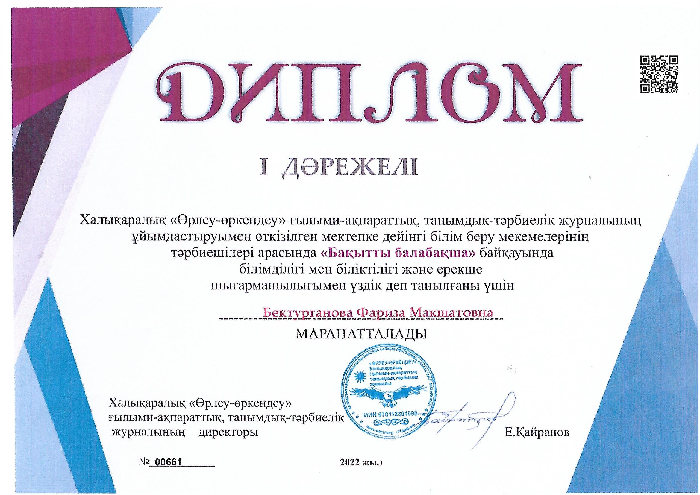 Халықаралық «Өрлеу өркендеу» ғылыми ақпараттық,танымдық- тәрбиелік журналының ұйымдастыруымен өткізілген «Бақытты балабақша» байқауында I дәрежелі диплом