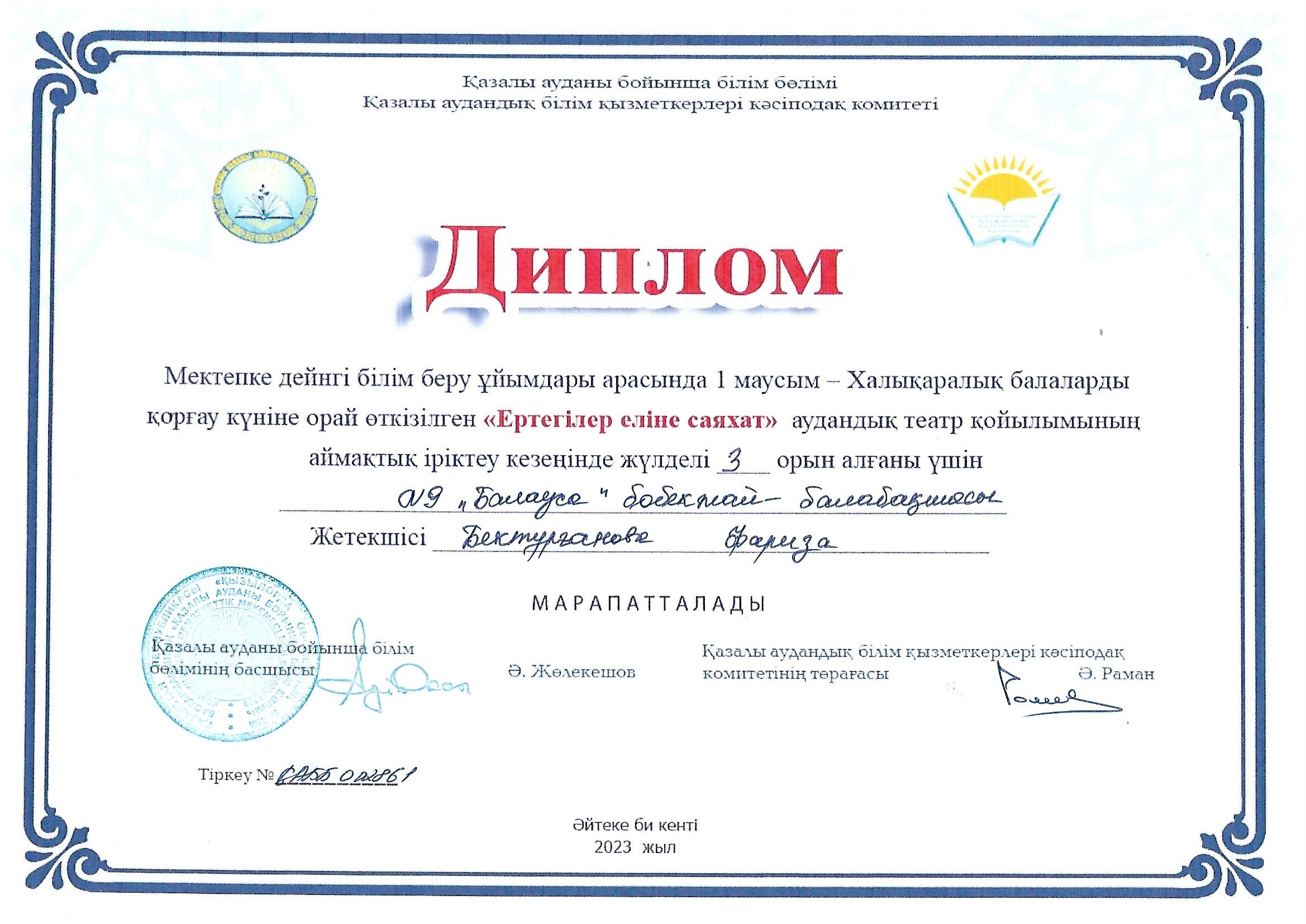Мектепке дейінгі білім беру ұйымдар арасында 1 маусым- Халықаралық балаларды қорғау күніне орай өткізген «Ертегілер еліне саяхат» аудандық театр қойылымының аймақтық іріктеу кезеңінде жүлделі 3 орын алғаны үшін Диплом