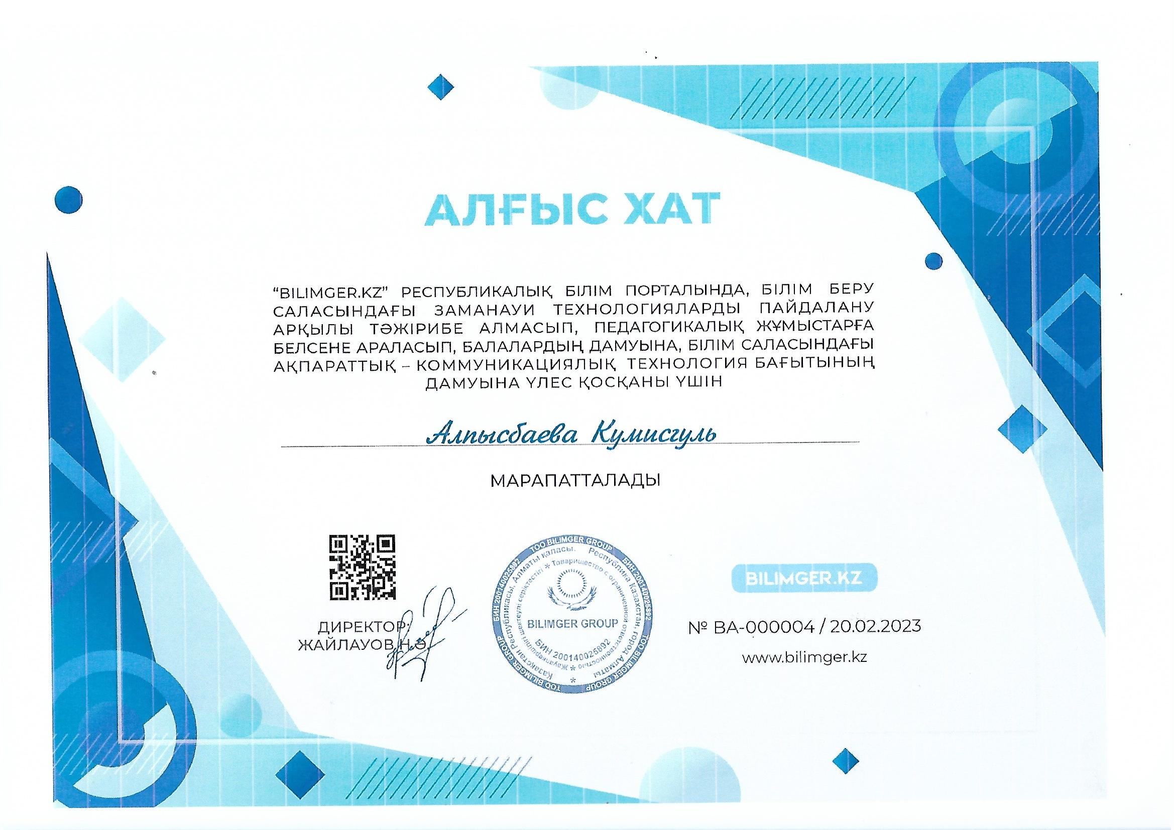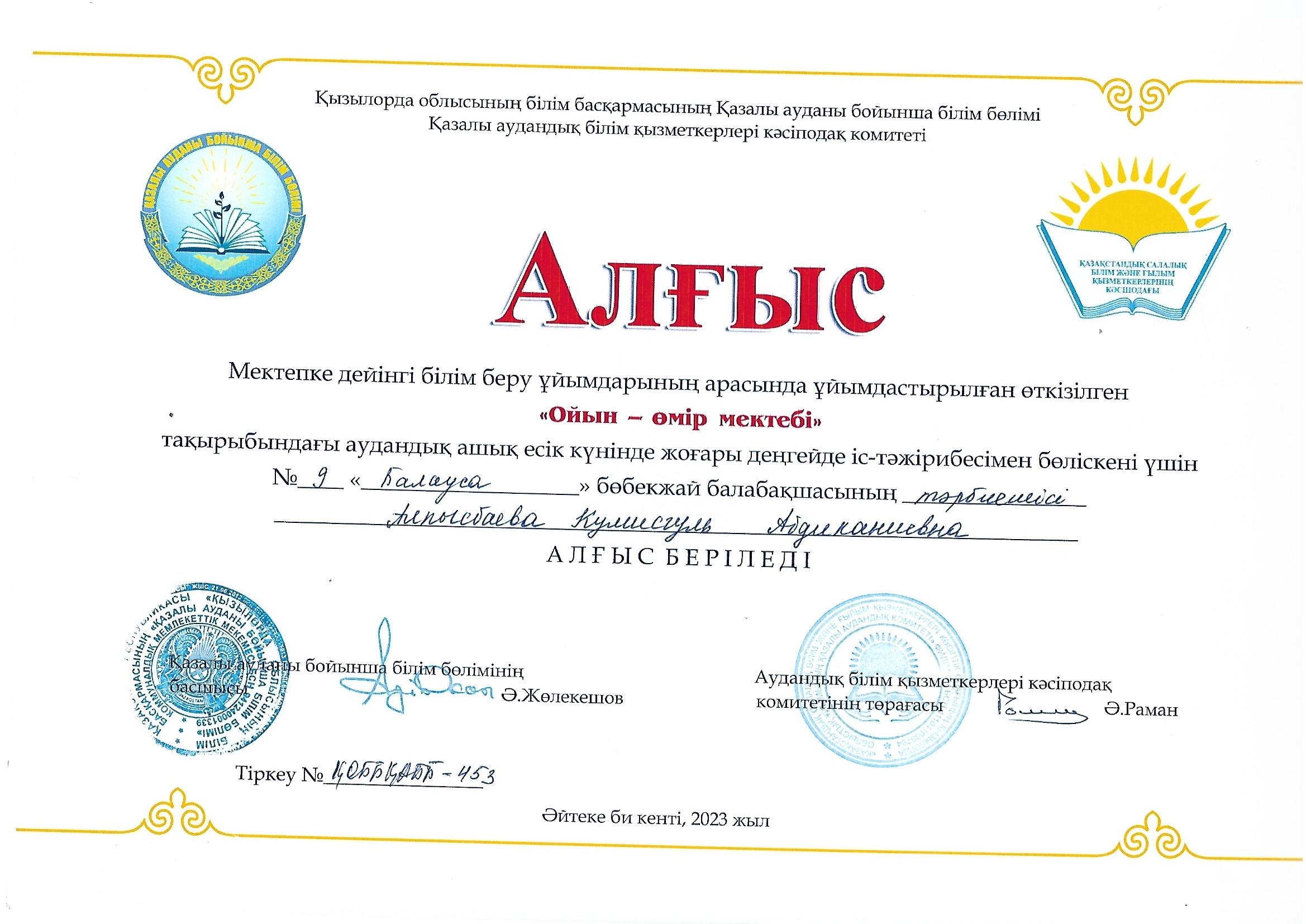 2023 жылы аудандық « Ашық есік» күнінде жоғары дәрежеде ашық оқу қызметі көрсеткен үшін « Алғыс» хат.
