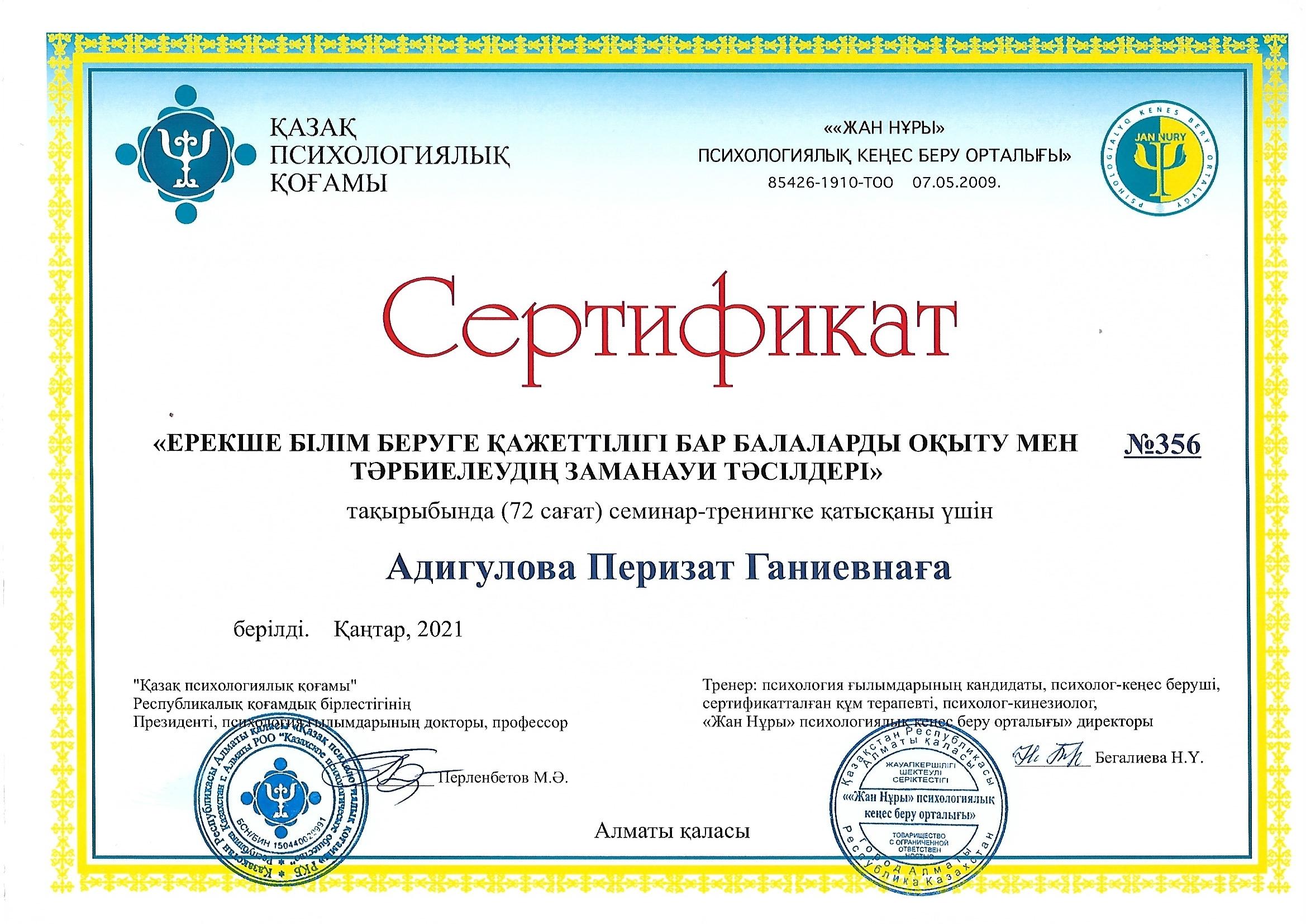 Біліктілік курсы: «Ерекше білім беру қажеттілігі бар балаларға оқыту мен тәрбиелеудің заманауи тәсілдері»72 сағат 2021ж