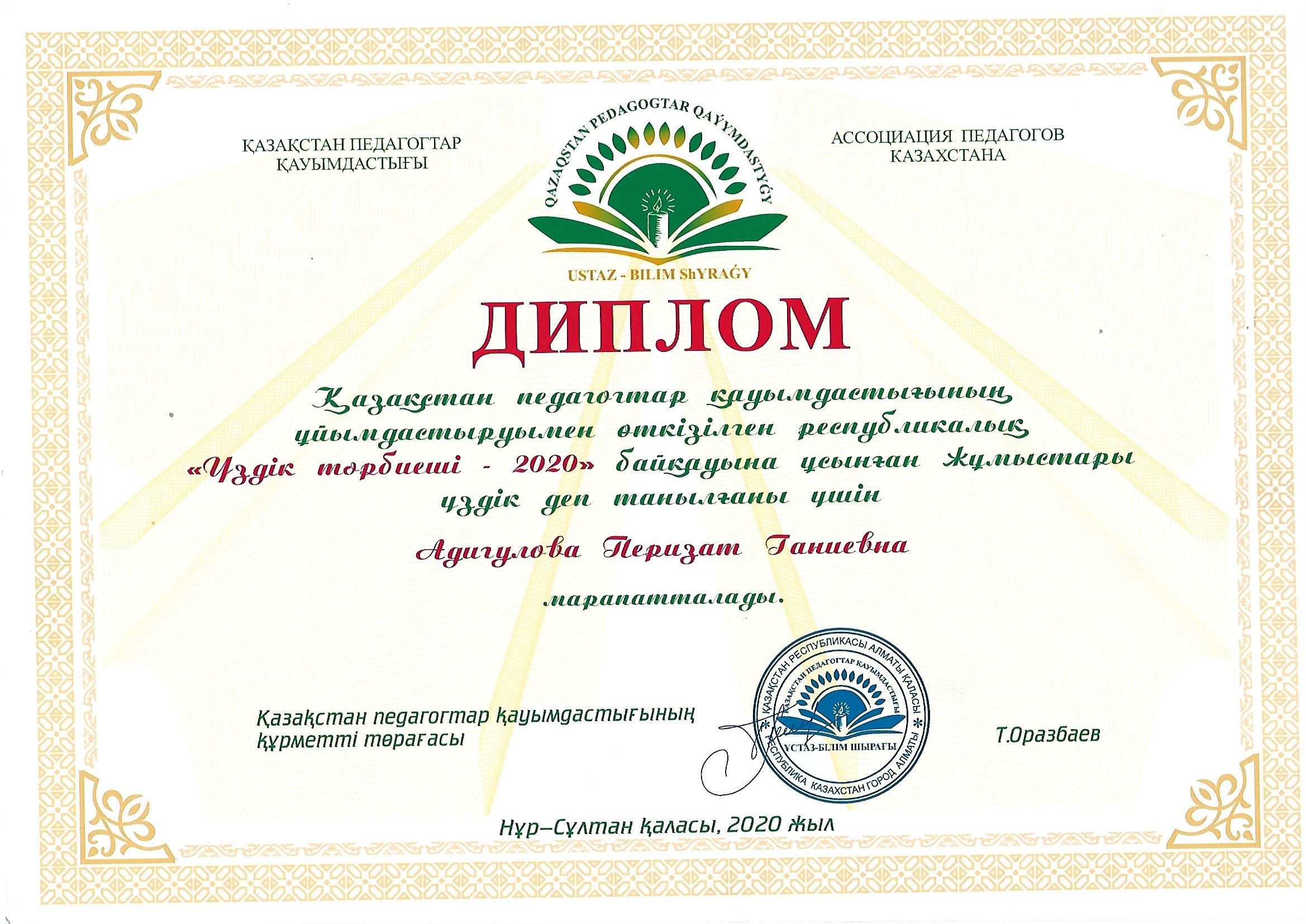 2020 жылы « Балбұлақ» Республикалық балалар мен жасөспірімдер сайтының балабақша бүлдіршіндер арасында ұйымдастырылған шығармашылық байқауына жас ұрпақты дамытуға үлес қосқаны үшін «Диплом»